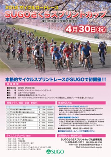 サイクルロードレースの情報が入ってきました。東北シクロクロスを開催したSさんの企画との事です。その名もSUGOさくらスプリントカップ。1周約3.7kmのサーキットコースをクラス別に2周から10周回する。チームタイムトライアルも有り!8月にはMT…